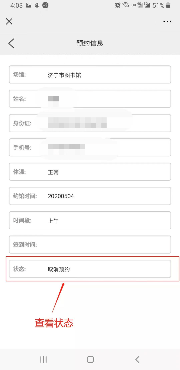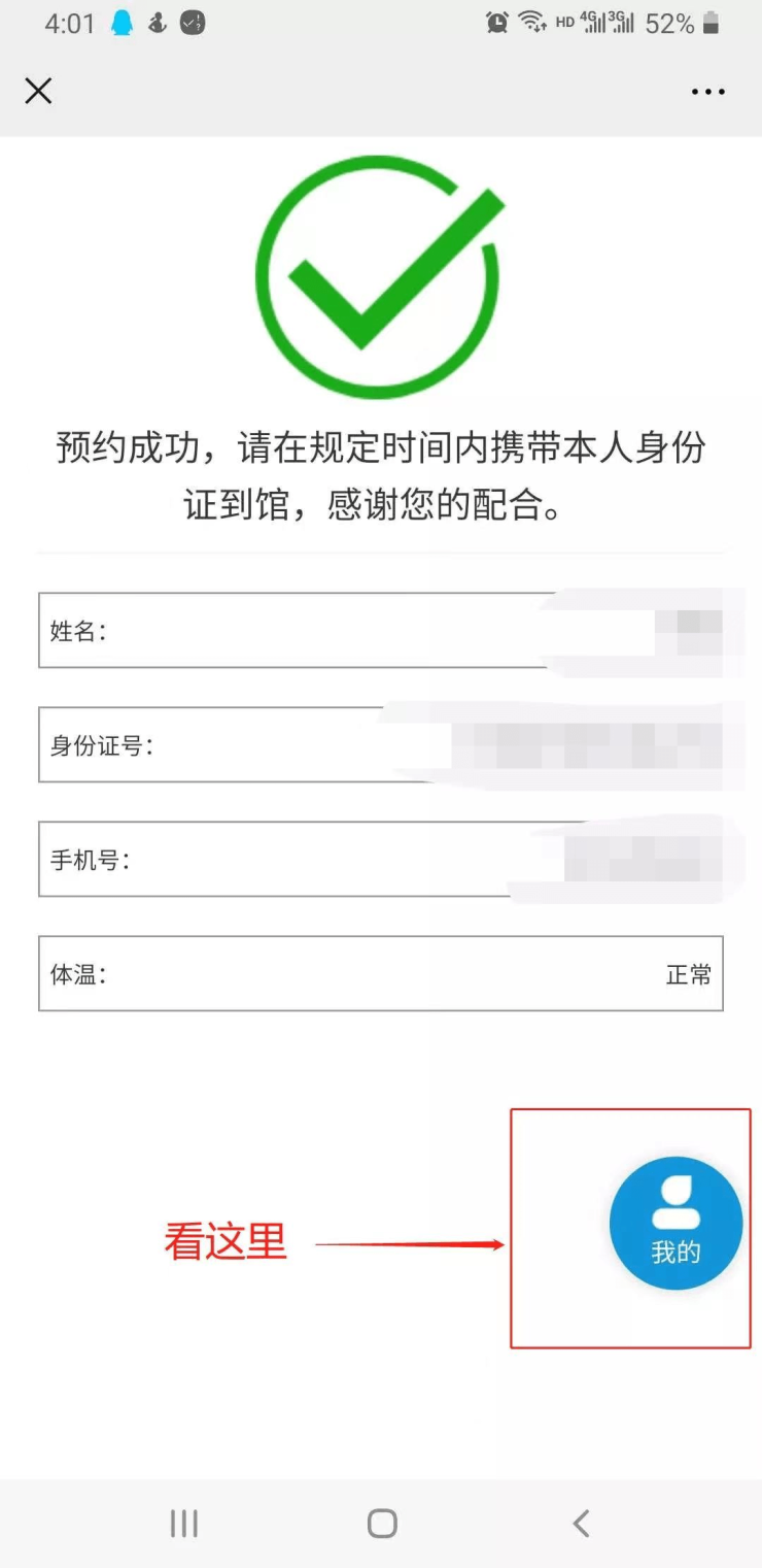 3.“取消预约”:预约成功后,可再次进入预约系统首页,在右下角“我的”里可查看自己的预约信息;如发现有预约错误或者预约后无法到馆,可在“我的”里查找到已经预约的信息进行取消操作。(具体操作见下图)