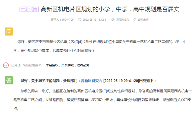 近日,搜狐网济宁小编在济宁市网络问政平台上注意到有网友提问:请问济宁市高新分区机电片区(Gjd)控制性详细规划”这个里面关于机电一路和机电二路两侧的小学,中学,高中规划是否属实,若属实预计什么时间建设?