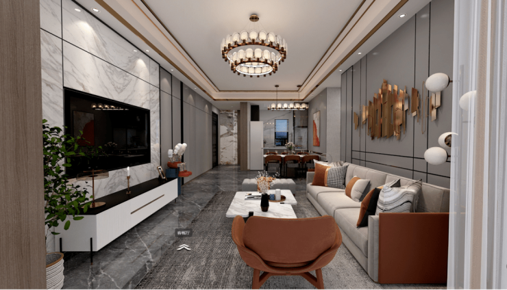入户进门后首先映入眼帘的是餐客厅,餐厅、客厅、厨房及阳台在一条直线上融为一体,形成一个大尺度的整体空间。