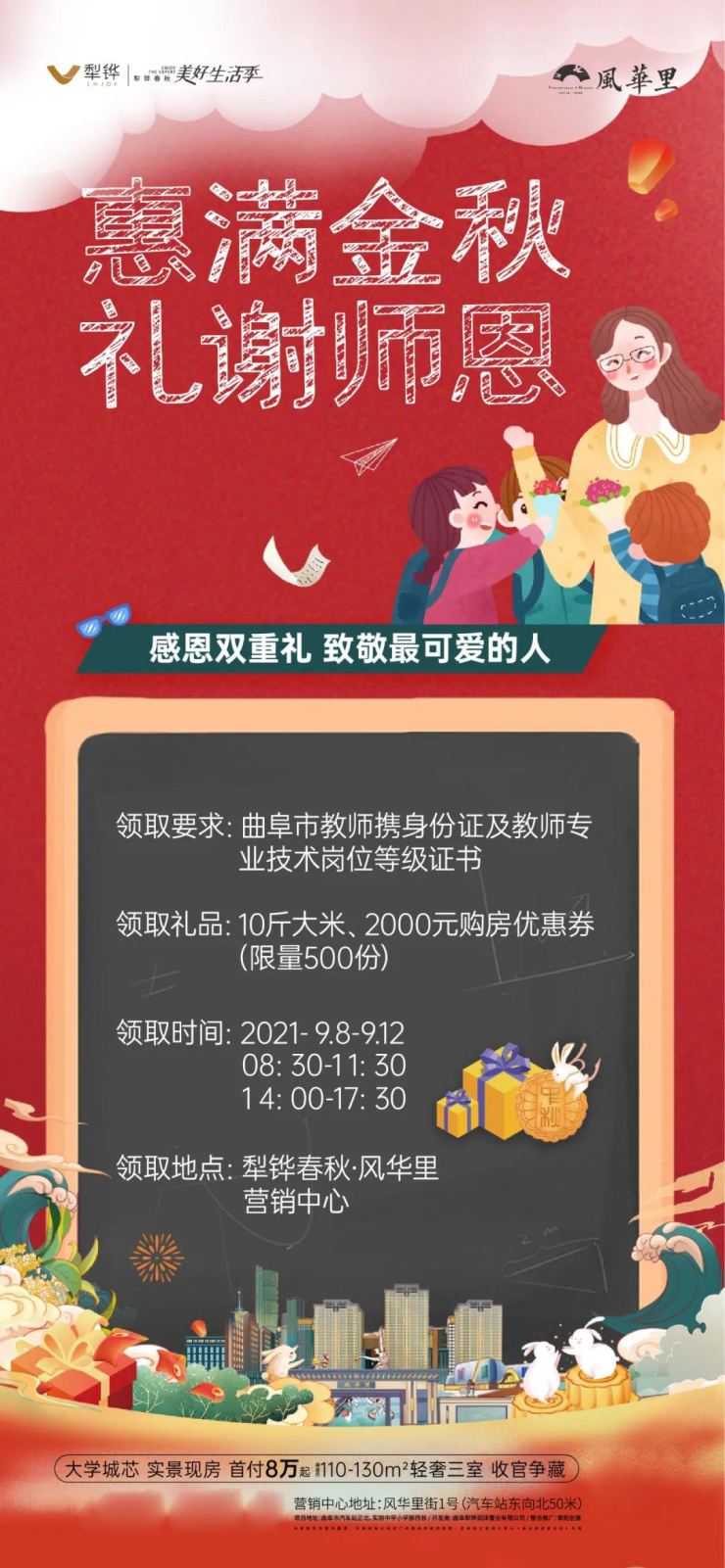 犁铧春秋风华里礼谢恩师,十斤大米免费送。领取要求:曲阜市教师携身份证及教师专业技术岗位等级证书。领取礼品:十斤大米、2000元购房优惠券(限量500份)