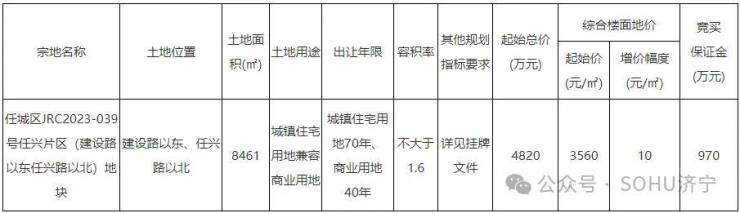 地块名:任城区JRC2023-039号任兴片区(建设路以东任兴路以北)地块【山东地源房地产开发有限公司竞得】
