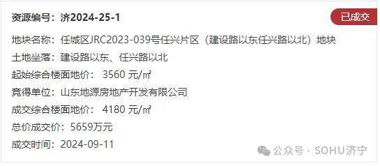 搜狐网济宁小编相关渠道获悉:2024年9月11日上午,济宁市任城区1宗国有建设用地使用权集中开拍。根据济宁市公共资源交易中心公布的出让结果,1宗地块经过多轮竞价后成交,成交价为5659万元。