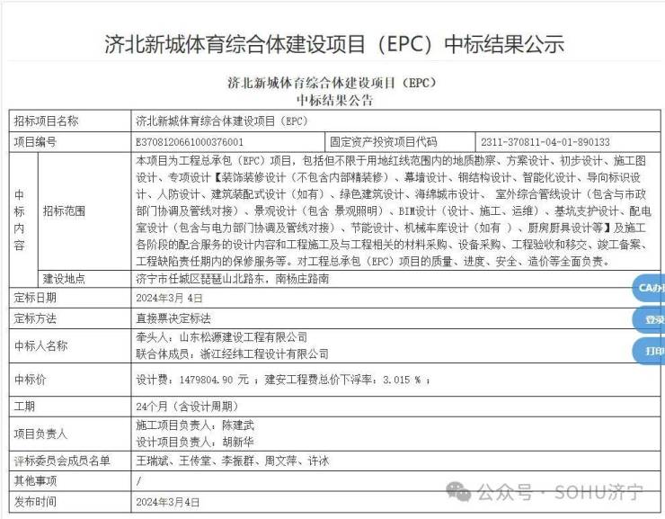2024年8月28日,济宁市自然资源和规划局发布济北新城体育综合体项目建设工程设计方案调整及建设工程规划许可批前公告。变更内容:1.原地上配电室和换热站建筑面积共450平方米,调整至地下一层。2.原体育综合体地上建筑面积增加450平方米,具体调整内容为屋顶机房面积增加、设备夹层面积增加、建筑挑空部分下方空间面积增加。3.外幕墙完成面角点坐标局部调整。4.建筑密度由30%调整为27%。