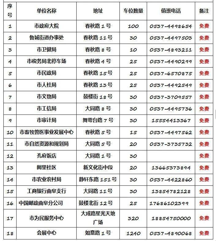二、曲阜机关企事业单位内部停车场免费对外开放18家,可提供停车位2035个(错时开放时间:9月30日18:30—10月9日7:30)。