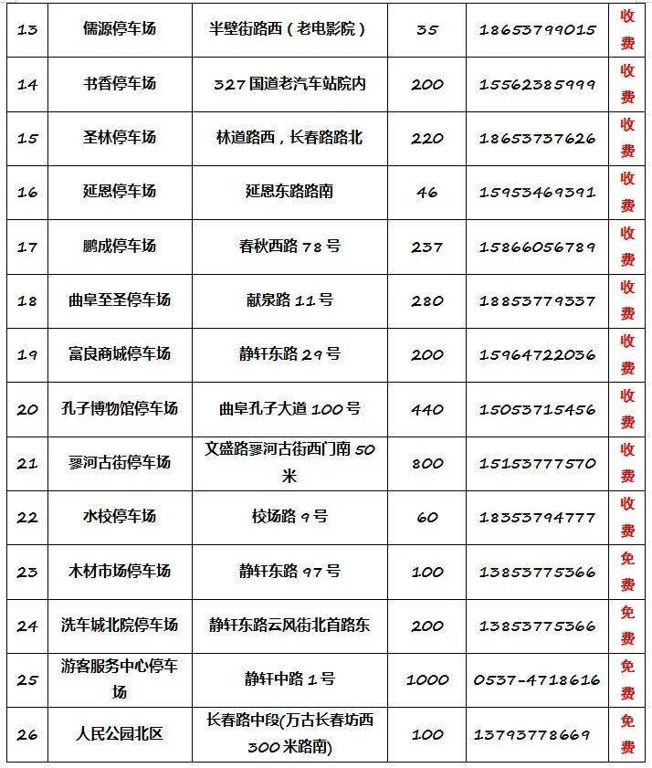 一、曲阜三孔景区周边、蓼河古街、孔子博物馆共有停车场26家,可提供停车位5345个。