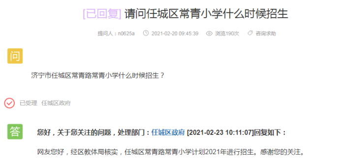 任城区政府回复:经区教体局核实,任城区常青路常青小学计划2021年进行招生。