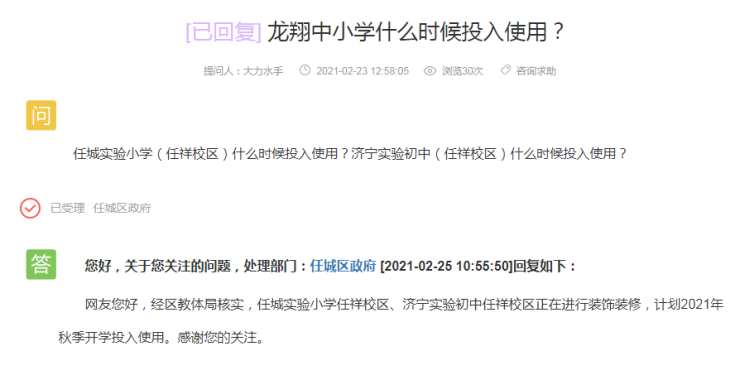 任城区政府回复:经区教体局核实,任城实验小学任祥校区、济宁实验初中任祥校区正在进行装饰装修,计划2021年秋季开学投入使用。