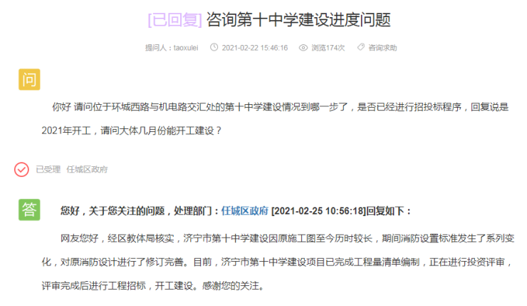任城区政府回复:经区教体局核实,济宁市第十中学建设因原施工图至今历时较长,期间消防设置标准发生了系列变化,对原消防设计进行了修订完善。目前,济宁市第十中学建设项目已完成工程量清单编制,正在进行投资评审,评审完成后进行工程招标,开工建设。