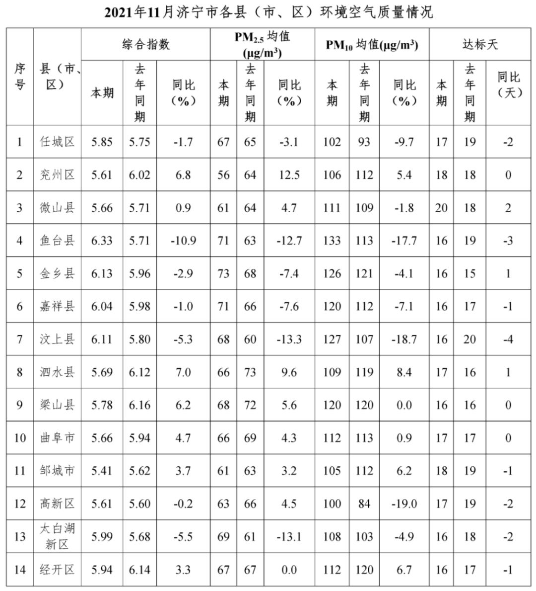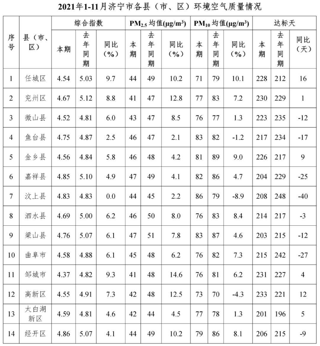 近日,济宁市生态环境局公布了2021年11月和1–11月全市及各县市区环境空气质量状况,详细内容如下: