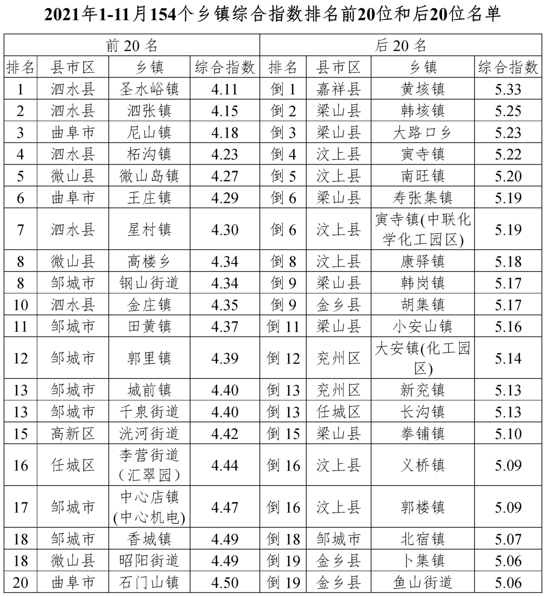 1-11月份,综合指数位列全市前20位的乡镇是:泗水县圣水峪镇、泗水县泗张镇、曲阜市尼山镇、泗水县柘沟镇、微山县微山岛镇、曲阜市王庄镇、泗水县星村镇、微山县高楼乡、邹城市钢山街道、泗水县金庄镇、邹城市田黄镇、邹城市郭里镇、邹城市城前镇、邹城市千泉街道、高新区洸河街道、任城区李营街道(汇翠园)、邹城市中心店镇(中心机电)、邹城市香城镇、微山县昭阳街道、曲阜市石门山镇。