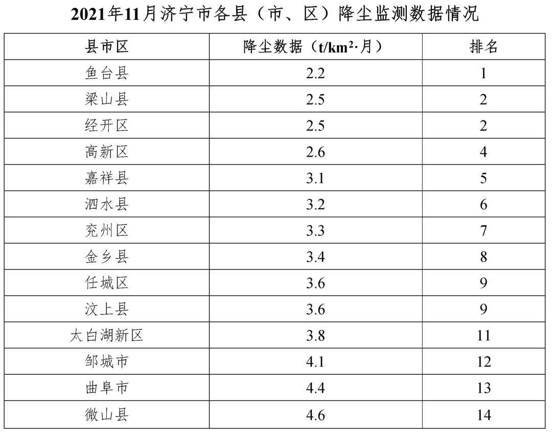 11月全市降尘量平均为3.4t/km2·月,14个县市区降尘量由低到高排名,前三名分别是:鱼台县排名前列名、梁山县和经开区并列第二名;后三名分别是:微山县倒数排名前列名、曲阜市倒数第二名、邹城市倒数第三名。