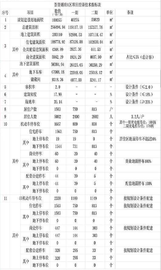 荟贤樾府A区项目规划建设用地面积10.06公顷(约151亩);总建筑面积:256494.94㎡;其中地上建筑面积为200110㎡、地下建筑面积为56384.94㎡;容积率为2.0;建筑密度17.99%;绿地率35.14%;计划总居住户(套)数为1563户(套),居住人数约5002人(按3.2人/户预算);建筑类型包括住宅、商业、社区食堂、其他公共配套设施等;规划机动车停车位1667个,非机动车位2338个。