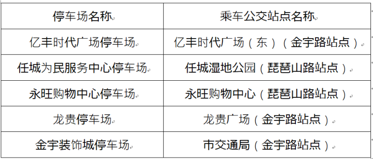 3.各停车场对应接驳公交线路乘车站点明细如下表所示: