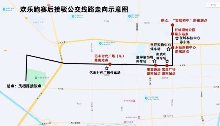 3、停靠站点:凤栖路接驳点、亿丰时代广场(东)、市交通局、龙贵广场、永旺购物中心、任城湿地公园、实验初中。
