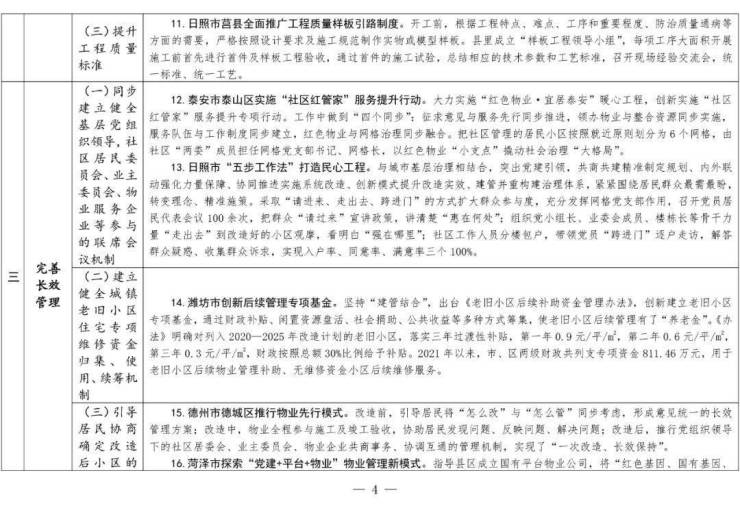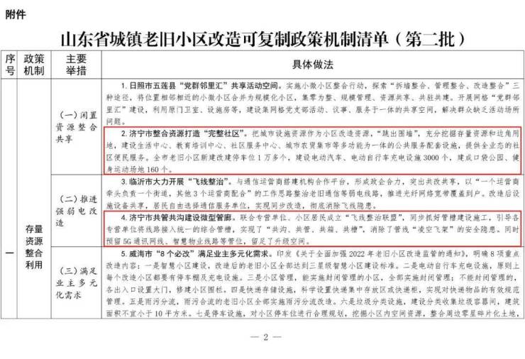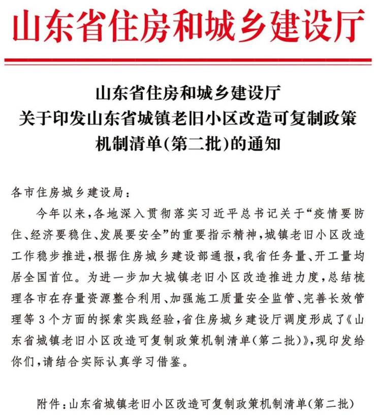 从济宁市住房和城乡建设局获悉, 近日,省住建厅下发《关于印发山东省城镇老旧小区改造可复制政策机制清单(第二批)的通知》,转发了各地市20项老旧小区改造工作可复制政策机制清单。其中,“济宁市整合资源打造‘完整社区’”、“济宁市共管共沟建设微型管廊