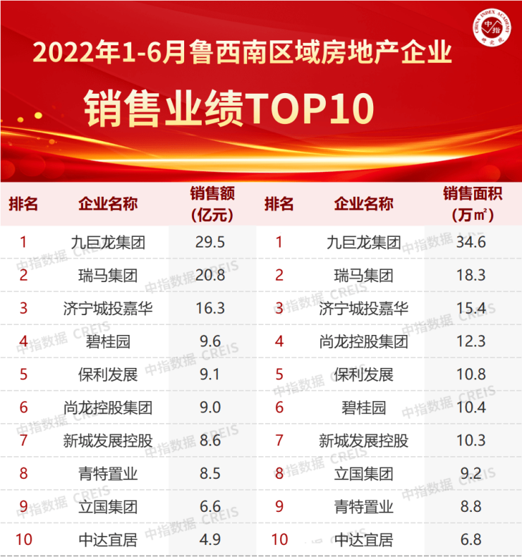 2022年上半年鲁西南区域房地产企业销售业绩TOP10出炉