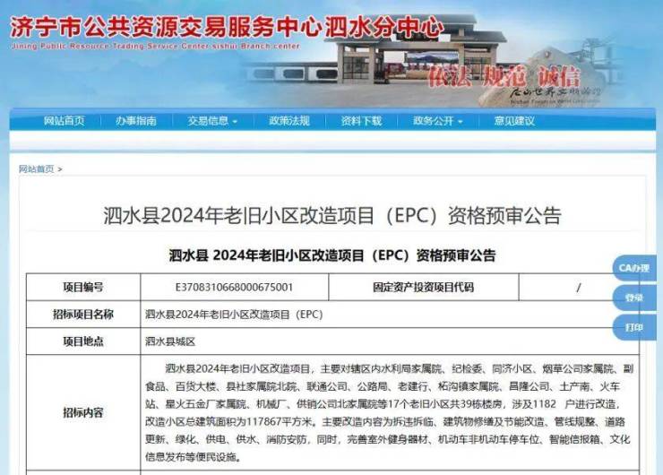 泗水县2024年老旧小区改造项目,主要对辖区内水利局家属院、纪检委、同济小区、烟草公司家属院、副食品、百货大楼、县社家属院北院、联通公司、公路局、老建行、柘沟镇家属院、昌隆公司、土产南、火车站、星火五金厂家属院、机械厂、供销公司北家属院等17个老旧小区共39栋楼房,涉及1182户进行改造,改造小区总建筑面积为117867平方米。主要改造内容为拆违拆临、建筑物修缮及节能改造、管线规整、道路更新、绿化、供电、供水、消防安防,同时,完善室外健身器材、机动车非机动车停车位、智能信报箱、文化信息发布等便民设施。