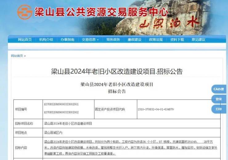 梁山县2024年老旧小区改造建设项目,共划分为两个标段,工程内容为改造36个小区,87 栋楼,总建筑面积291049.28平方米,改造内容包括建筑物修缮、水电改造、管线规整及光纤入户、地下雨污分流、外墙保温、屋面防水、增加监控、安防设施及室外基础配套工程。