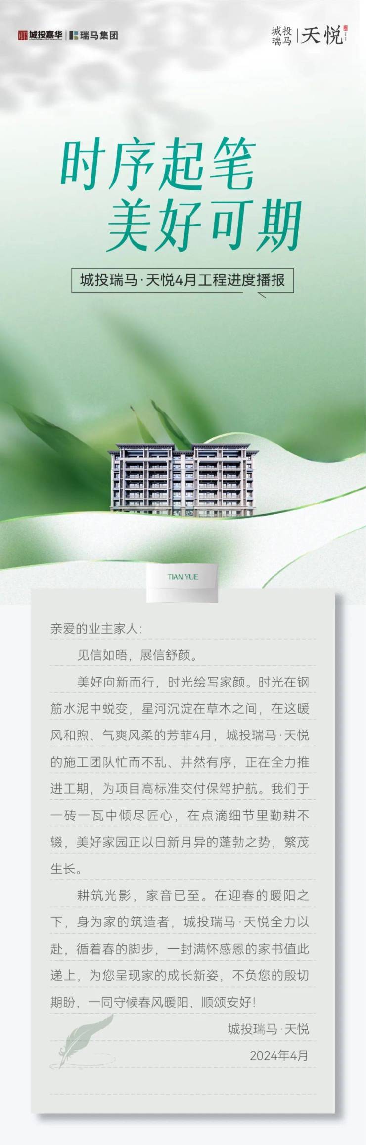 耕筑光影,家音已至。在迎春的暖阳之下,身为家的筑造者,城投瑞马·天悦全力以赴,循着春的脚步,一封满怀感恩的家书值此递上,为您呈现家的成长新姿,不负您的殷切期盼,一同守候春风暖阳,顺颂安好!