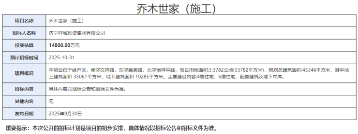 2025年9月30日,乔木世家(施工)招标计划发布。