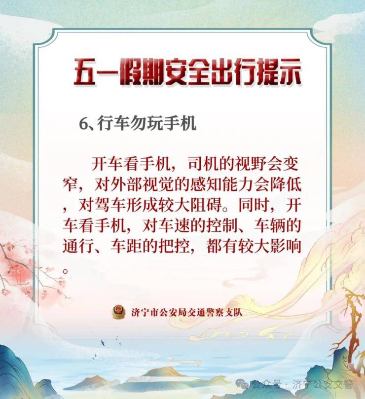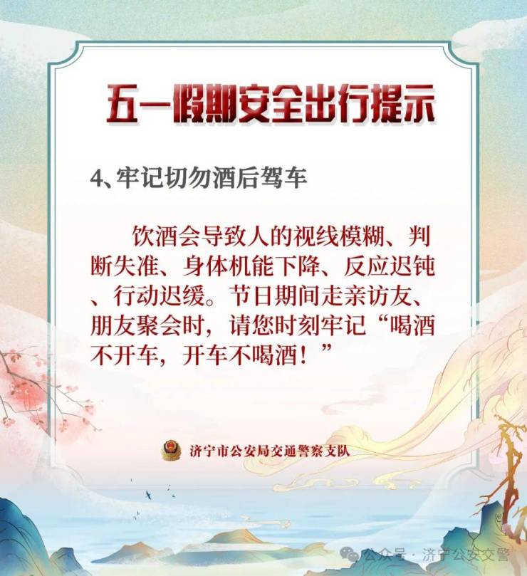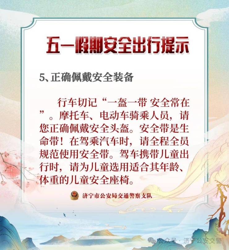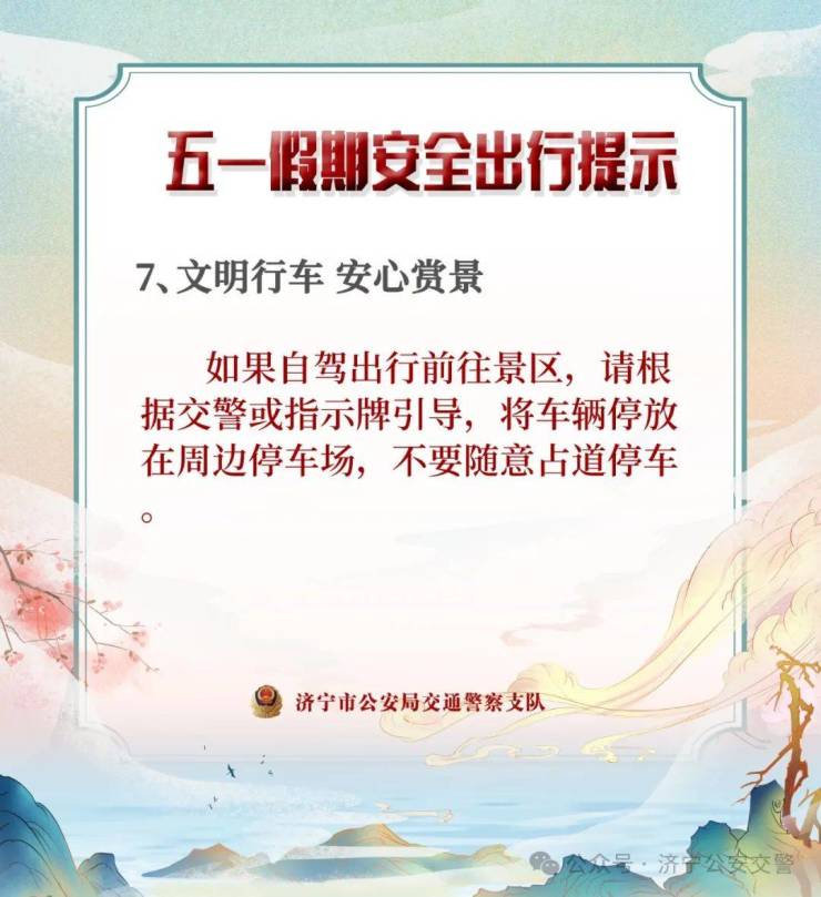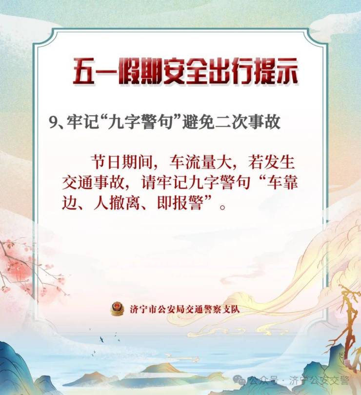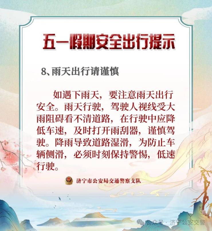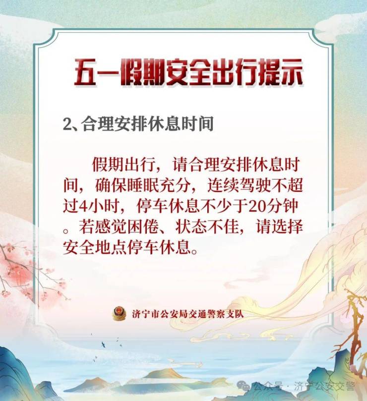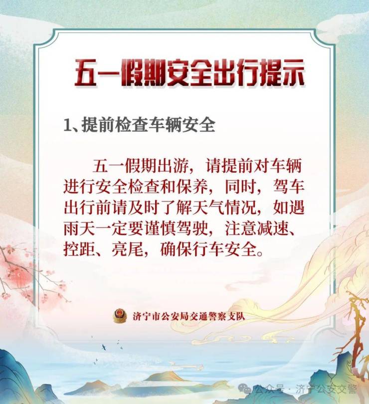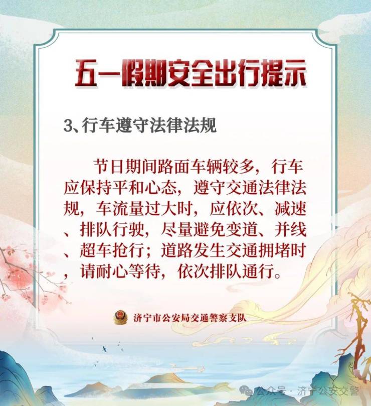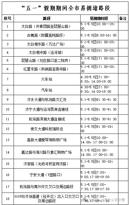 为做好“五一”劳动节期间道路交通安全管理工作,济宁公安交警结合辖区道路交通实际情况发布“两公布一提示”,提醒广大交通参与者合理选择出行时间、线路、方式,做到谨慎驾驶、安全出行。