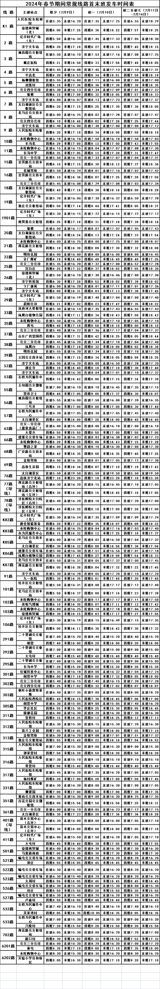 (一)常规线路2月9日(除夕)上午发车时间不变,2月9日(除夕)下午—2月16日(正月初七)下午首末班发车时间作出调整(详情见附表)。2月17日(正月初八)恢复原有时间运行。