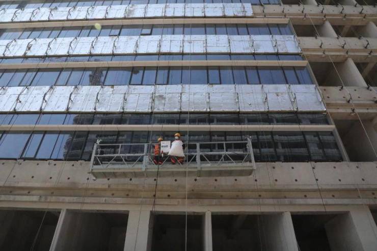 “现在安装的是单一玻璃幕墙,通过前期在工厂内加工成型,到施工现场后直接就可以安装在外墙上,减少了现场施工工序,大大节省了施工时间,加快了施工进度。”项目总工程师王建平说,在传统的外墙安装上,一天能安装40平方米,现在仅需要5人就可以能达到250平方米。而另一座大楼外墙上,工人正在进行龙骨焊接,为下一步目前安装做前期准备。截至目前,幕墙工程完成30%。