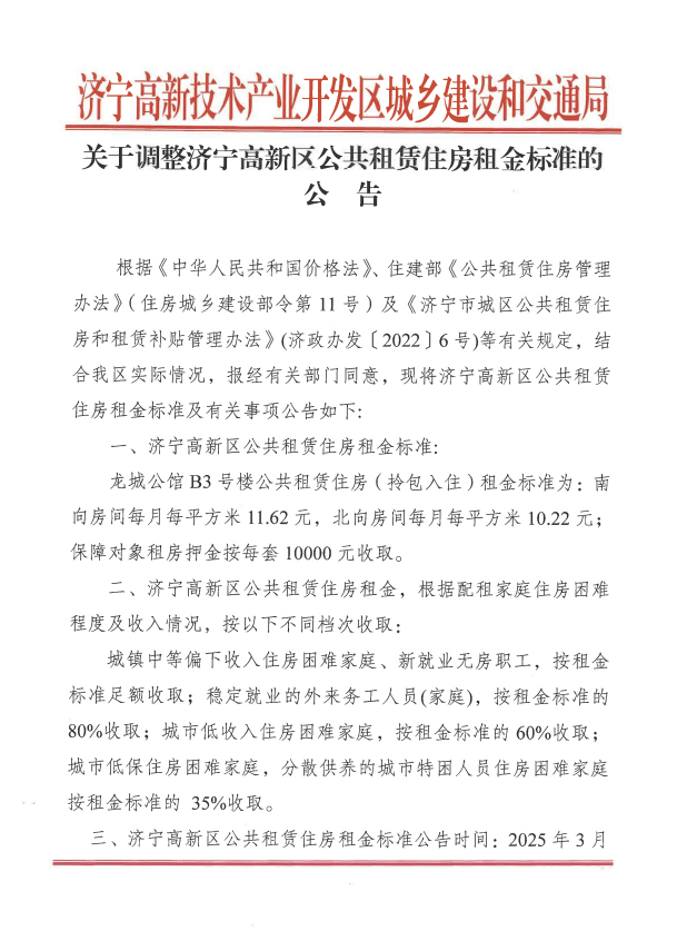近日,搜狐网济宁小编了解到:济宁高新区城乡建设和交通局发布了关于调整济宁高新区公共租赁住房租金标准的公告,详情如下。
