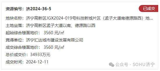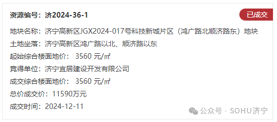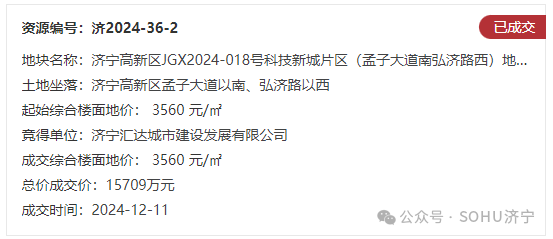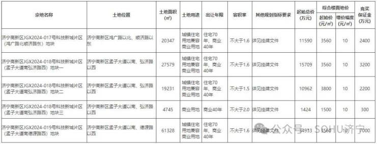 土地位于:济宁高新区孟子大道以南、弘济路以西;土地面积:27579㎡(约41.4亩);土地用途:城镇住宅用地兼容商业用地;出让年限:住宅70年,商业40年;容积率不大于1.6;起始价:15709万元,综合楼面价起价:3560元/㎡;最终成交价为:15709万元(约379万元/亩),综合楼面地价成交价:3560元/㎡;溢价率:0.0%;