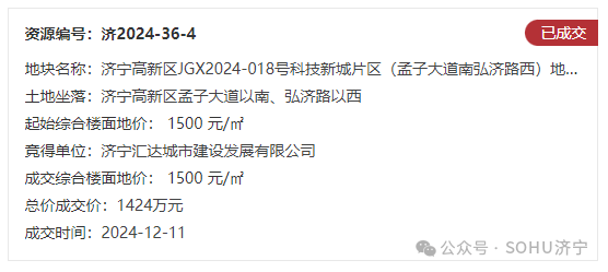 地块四:济宁高新区JGX2024-018号科技新城片区(孟子大道南弘济路西)地块三【济宁汇达城市建设发展有限公司竞得】