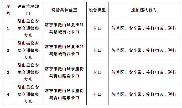 为维护道路交通秩序,保障交通参与者出行安全,依据《中华人民共和国道路交通安全法》及有关道路交通安全法律法规, 微山县公安局交通警察大队在辖区道路改造新增4处交通技术监控设备,现对改造升级及新增设备予以公示,自公示之日起5个工作日后,将对有关交通违法行为依法管理。