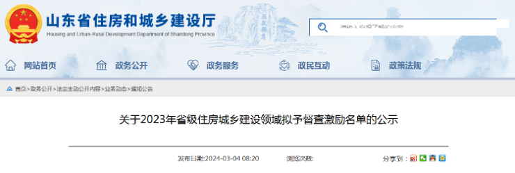 近日,搜狐网济宁小编从山东省住房和城乡建设厅官网了解到,根据省委办公厅、省政府办公厅《关于对真抓实干成效明显地方加强督查激励的通知》和省住房城乡建设厅、省财政厅《山东省住房城乡建设领域督查激励措施实施办法》,经各设区市择优推荐,省住房城乡建设厅会同有关部门开展综合评价,研究提出了2023年省级住房城乡建设领域拟予督查激励名单,具体如下。