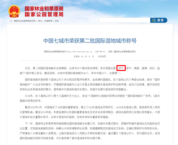 近日,国际《湿地公约》组织官方和国家林草局官方网站发布消息,第二批国际湿地城市名单揭晓,济宁市作为国际25个城市之一、中国7个城市之一、山东少有城市,获得“国际湿地城市”称号。