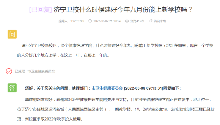 近日,搜狐网济宁小编注意到有网友在济宁市网络问政平台上提问:请问济宁卫校新校区,济宁健康护理学院,什么时候建好今年九月份能上新学校吗?地址在哪里,现在一个学校的人分好几个地方上学,在这上一年,在那上一年的。