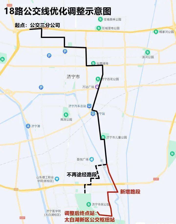 撤除:京杭路河都路、河都路、鸿顺观邸东门、济宁国投、运河路济宁大道、南风花园(上行)、市政务服务中心、圣贤路公交首末站共8站,新增:水运雅居西门、温泉小镇西门、城投鹿港南门、车站南路常兴路、晨阳湖润(西)、太白湖新区公交枢纽站共6站。线路单程增加1.3公里,配车、间隔不变。