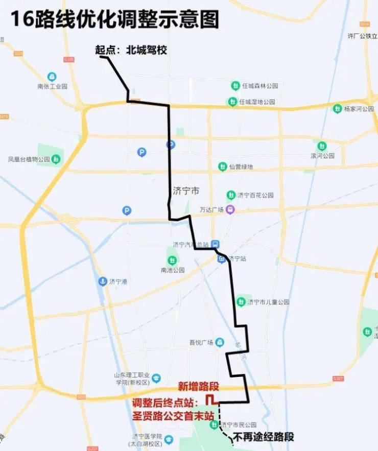 16路调整后,由“北城驾校”发车,沿原线路运行至圣贤路,沿圣贤路向西至市政务中心,经市政务中心沿春华路至终点站“圣贤路公交首末站”。