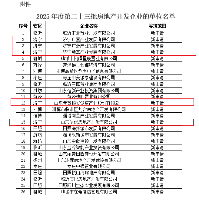 济宁5家!2025年度第二十三批房地产开发企业资质名单发布