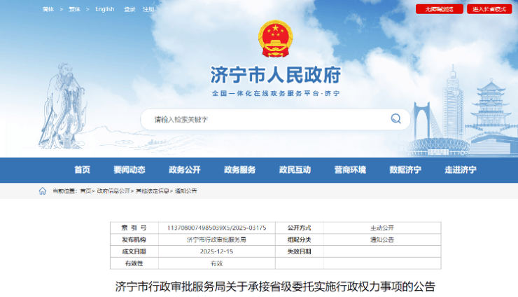 根据《中华人民共和国行政许可法》《中华人民共和国行政处罚法》《山东省行政程序规定》(省政府令第238号)、《山东省人民政府关于部分省级行政权力事项委托实施的决定》(省政府令第368号)等有关法律法规、规章的规定,自2025年12月15日起,济宁市行政审批