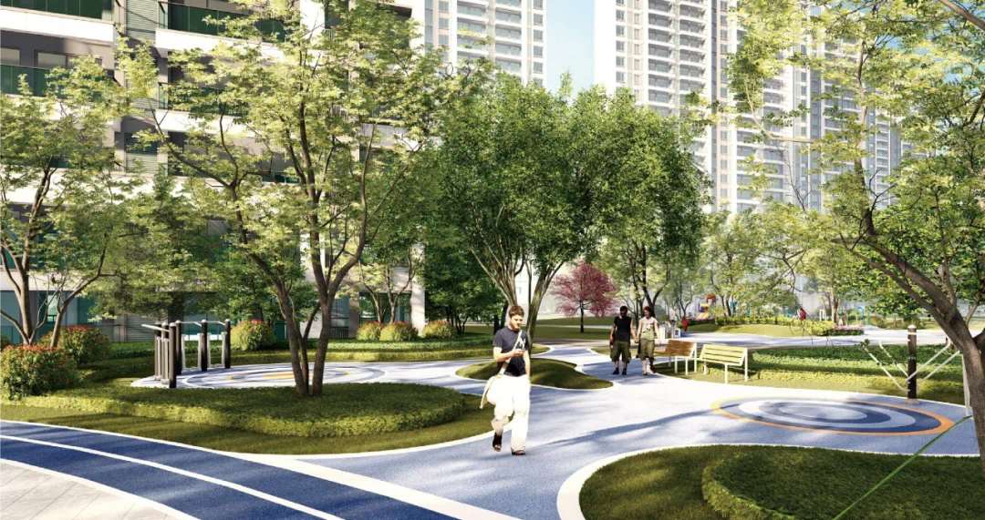楼下万余平全龄休闲活动区—绿心花园,健身器械/幼儿感知区/攀爬小丘/探险山丘/阳光草坪/休憩廊架等功能区下楼即达,满足0-60岁+全龄段休闲运动需求。