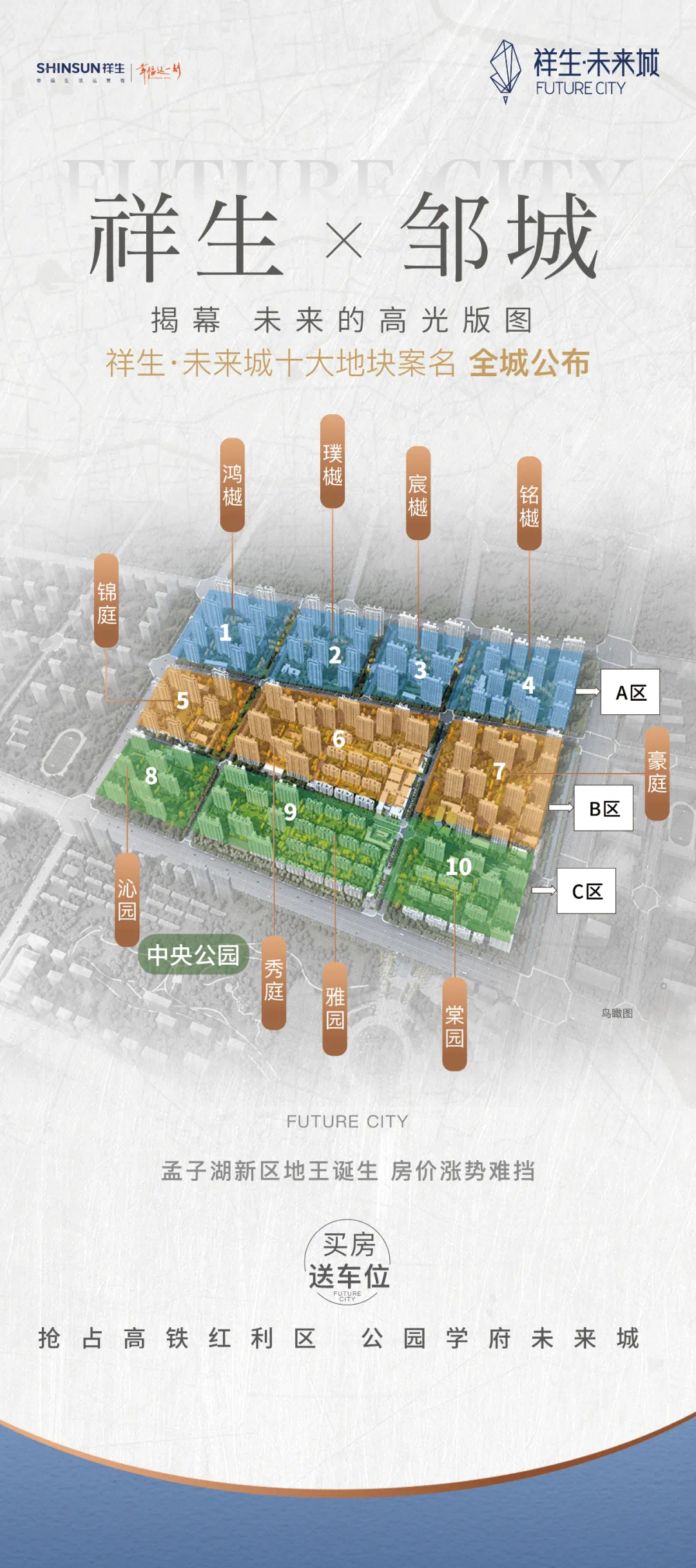 祥生·未来城占地约1100亩,共规划十大地块,凭借着实力品牌来自长三角地区的严苛与偏执,深耕邹城数载,对自我要求更高,经过多轮探讨推敲,终于决定将十大地块案名面世,特此公告大家悉知: