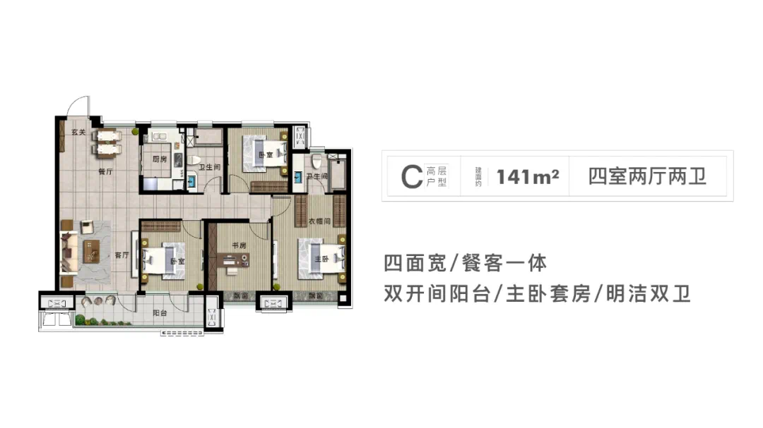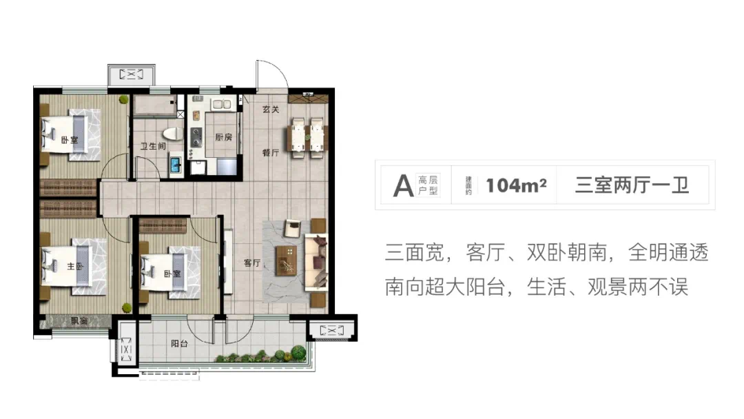 三个卧室和客厅,享宽幕视野南向四个观景窗口,享受多一份中央景观资源