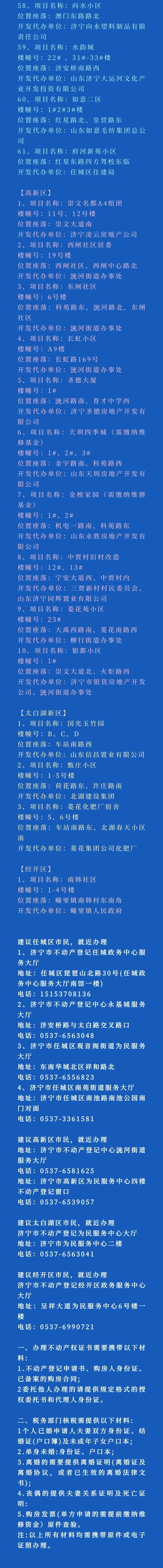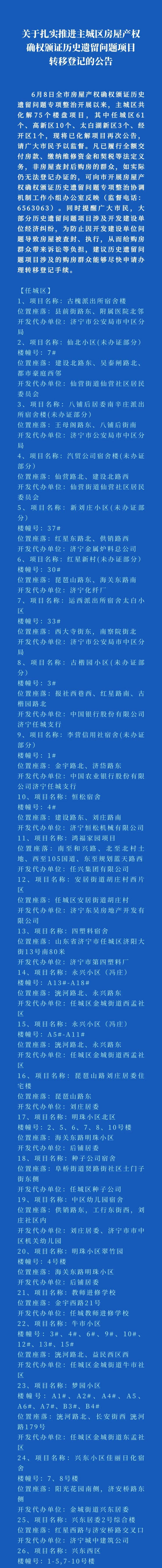 6月8日全市房屋产权确权颁证历史遗留问题专项整治开展以来,主城区共化解75个楼盘项目,其中任城区61个、高新区10个、太白湖新区3个、经开区1个,现将已化解项目再次公告