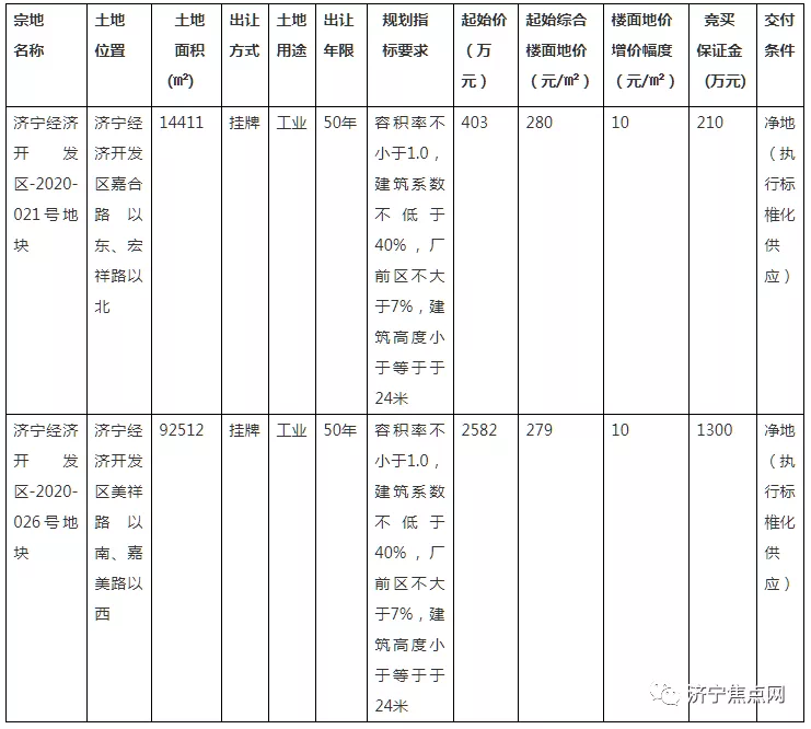 土地位于:济宁经济开发区美祥路以南、嘉美路以西;土地面积:92512㎡(约139亩);土地用途:工业用地;出让年限:50年;容积率不小于1.0;起始价:2582万元,综合楼面价起价:279元/㎡;交付条件为净地(执行标椎化供应);