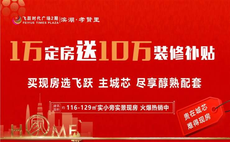 年末返乡置业季,钜惠狂欢购,助力省心安家,抢占主城芯·实小旁·品质现房,1万定房送10万装修补贴活动开始啦!限时限量抢购!臻席递减,先到先得 !飞跃时代广场2期 滨湖·孝贤里现房热销, 让每一位购房者,都能买的放心,买的安心!