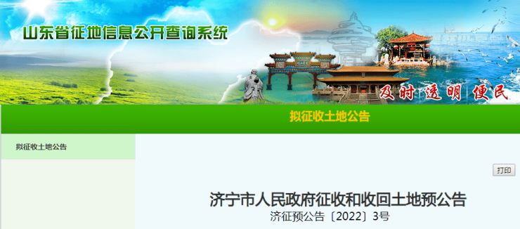 近日,搜狐网济宁小编相关部门获悉:为保障公共利益用地的需要,根据《中华人民共和国土地管理法》、《山东省土地征收管理办法》等法律法规的规定,经济宁市人民政府研究决定,拟征收太白湖新区2个街道(镇)7个村(单位)共2宗土地,现发布拟征收土地公告: