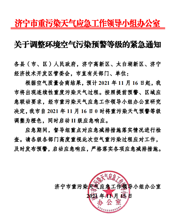 根据空气质量会商结果,预计2021年11月16日起,济宁市将出现连续性重度污染天气过程。按照提前预警、区域应急联动要求,经市重污染天气应急工作领导小组办公室研究决定,济宁市自 2021年11月16日0时将重污染天气预警等级调整为橙色,同时启动II级应急响应。