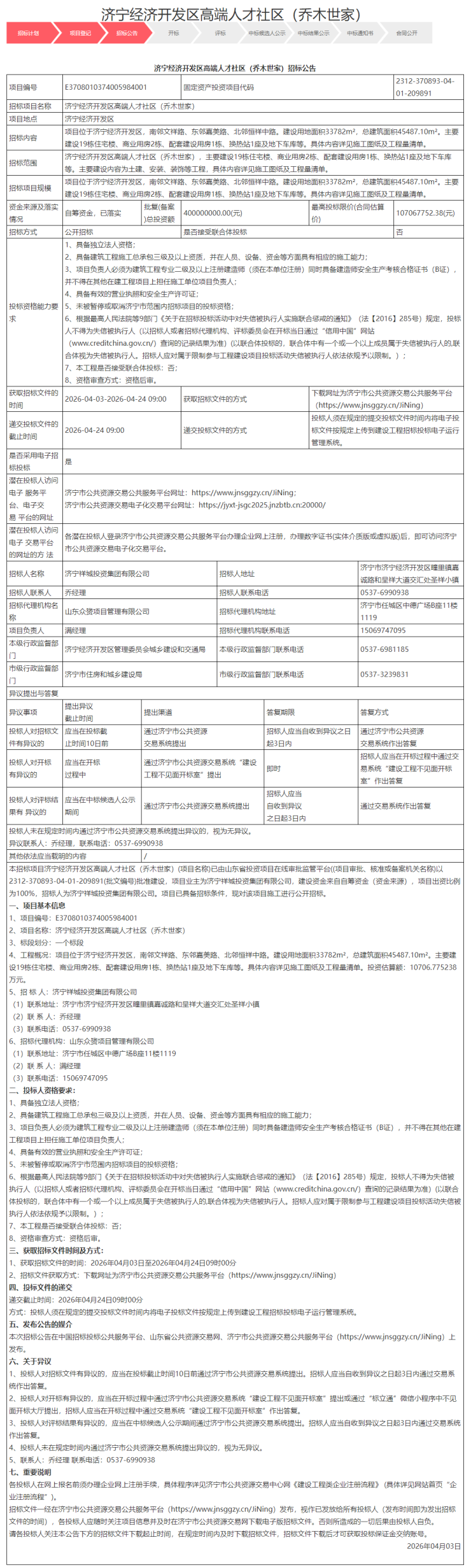 本招标项目济宁经济开发区高端人才社区(乔木世家)(项目名称)已由山东省投资项目在线审批监管平台((项目审批、核准或备案机关名称)以2312-370893-04-01-209891(批文编号)批准建设,项目业主为济宁祥城投资集团有限公司,建设资金来自自筹资金(资金来源),项目出资比例为100%,招标人为济宁祥城投资集团有限公司。项目已具备招标条件,现对该项目施工进行公开招标。