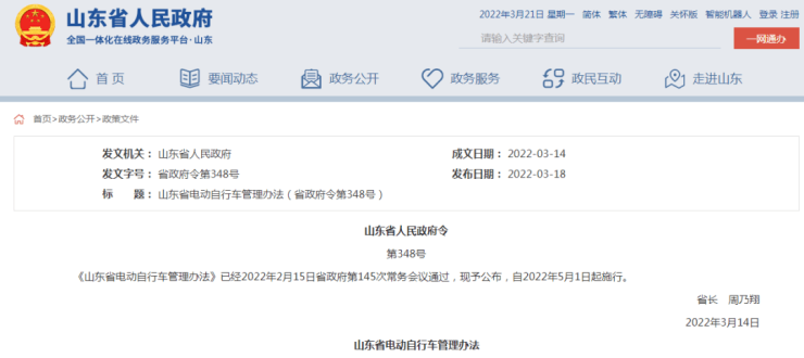 为了加强电动自行车管理,维护道路交通秩序,预防和减少道路交通、火灾事故,保护公民人身和财产安全。近日,省政府办公厅印发《山东省电动自行车管理办法》(以下简称《办法》),自2022年5月1日起施行。