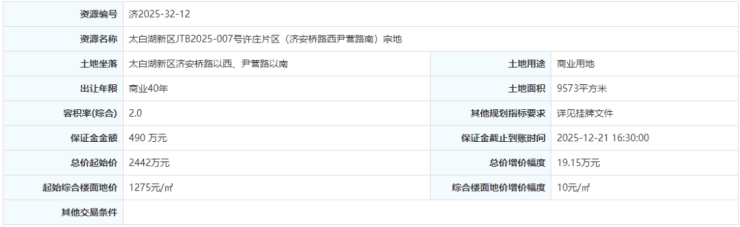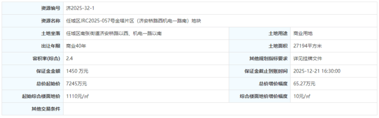 土地位于:任城区南张街道济安桥路以西、机电一路以南;土地面积:27194㎡(约41亩);土地用途:商业用地;出让年限:40年;容积率不大于2.4;起始价:7245万元,综合楼面价起价:1110元/㎡;