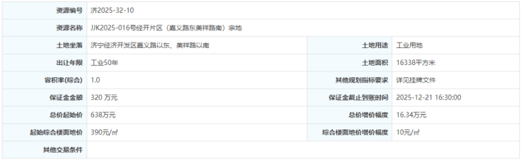 土地位于:济宁经济开发区嘉义路以东、美祥路以南;土地面积:16338㎡(约24.5亩);土地用途:工业用地;出让年限:50年;容积率不小于1.0;起始价:638万元,综合楼面价起价:390元/㎡;